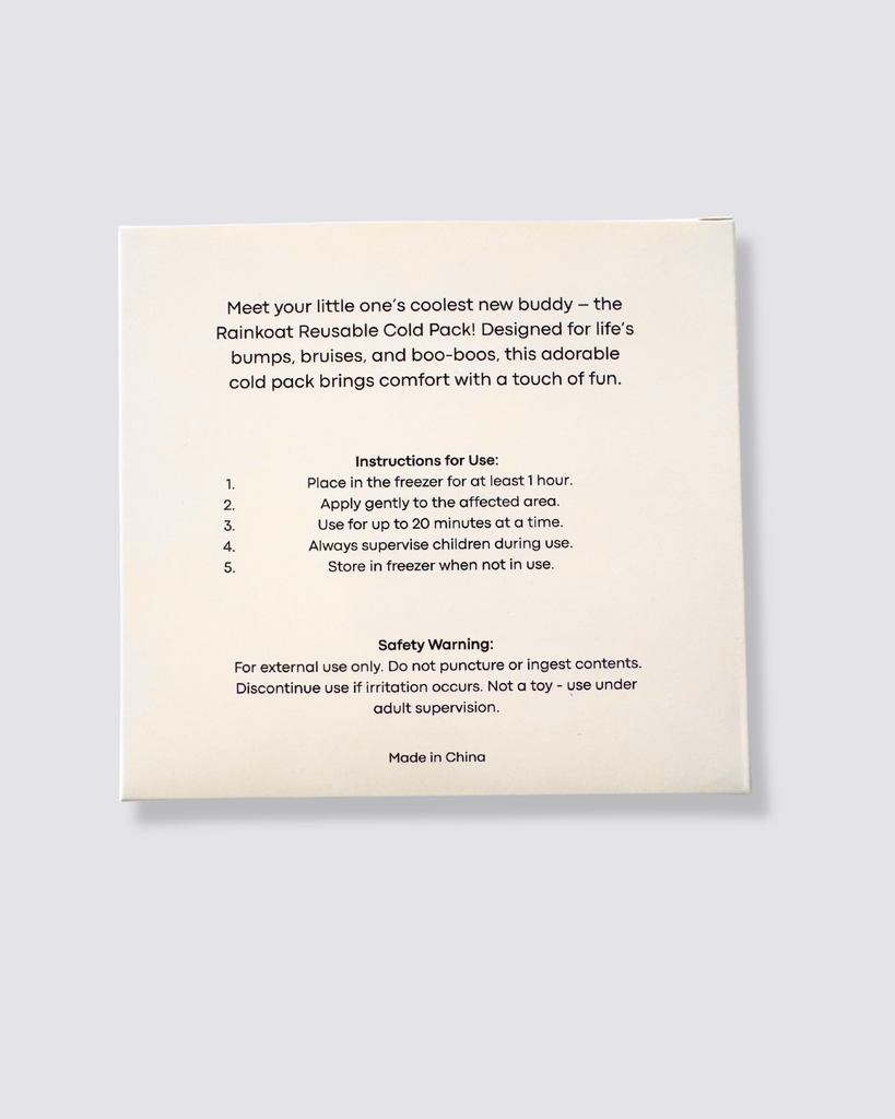 Meet your little one's coolest new buddy - the Rainkoat Reusable Cold Pack! Designed for life's bumps, bruises, and boo-boos, this adorable cold pack brings comfort with a touch of fun.